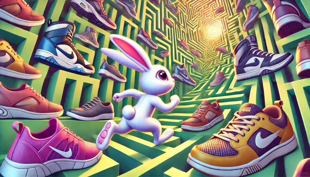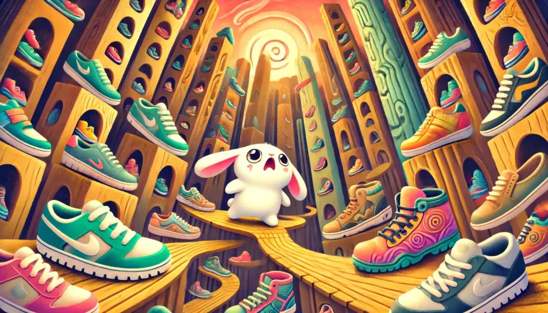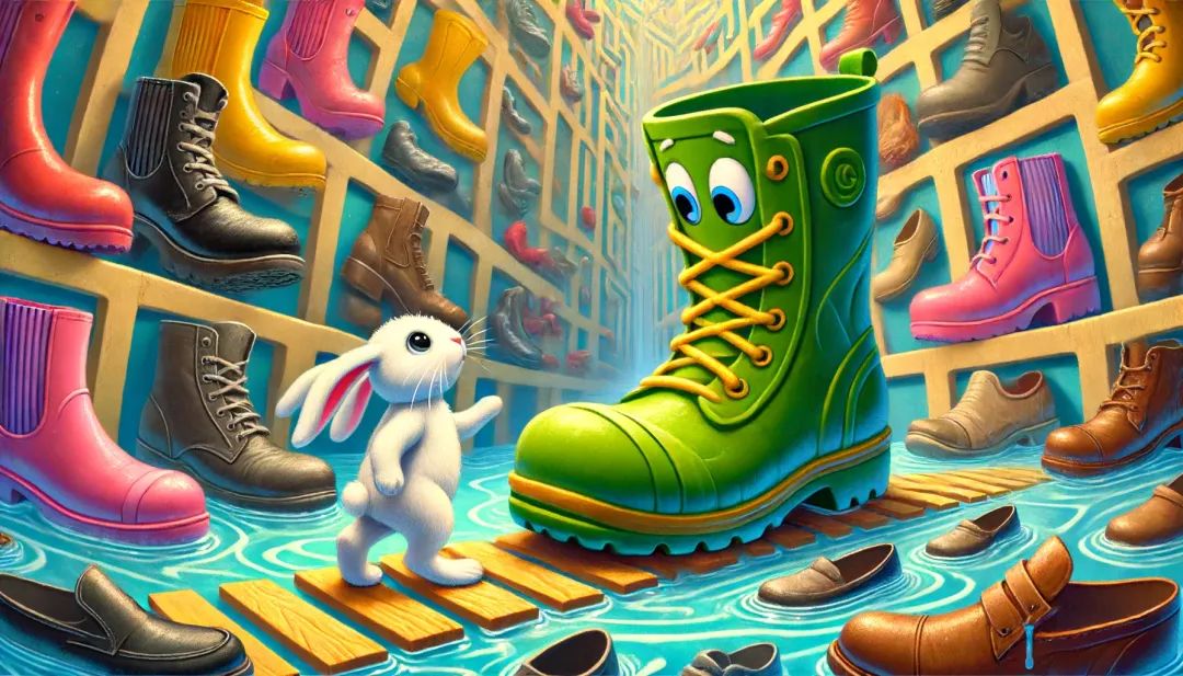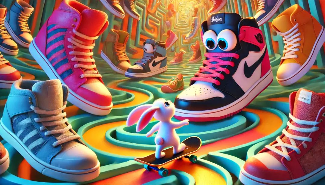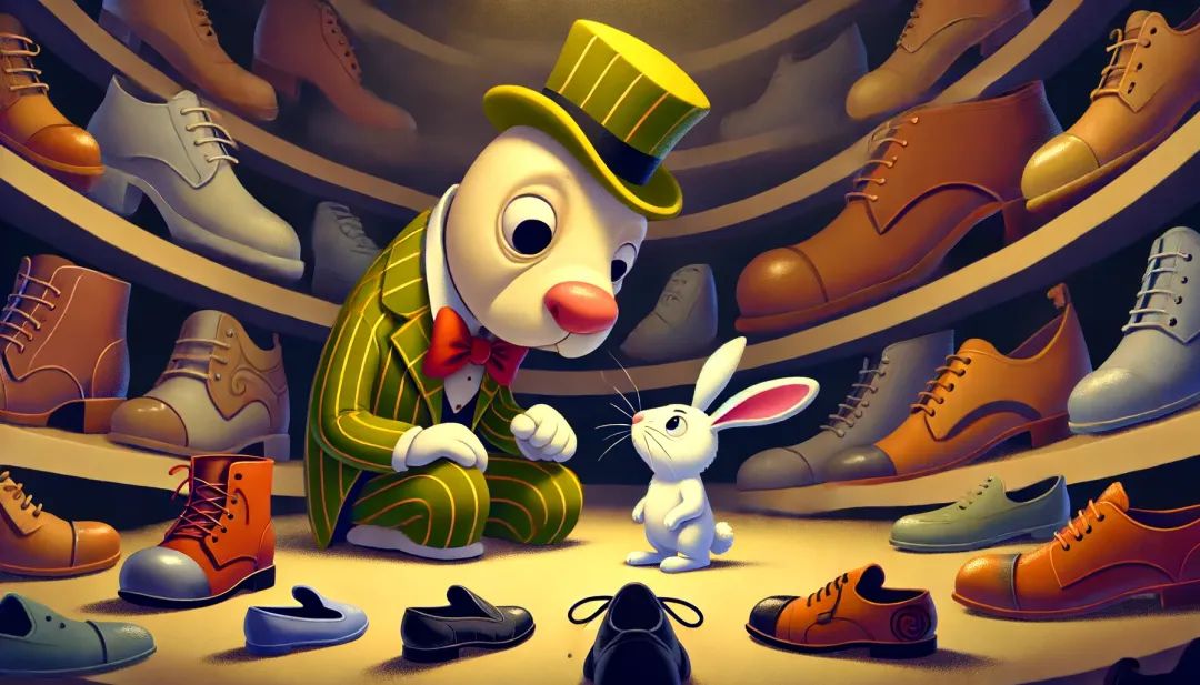 发现隐藏路线小白兔发现了一条由色彩缤纷的鞋子组成的隐藏路线,充满了探索的好奇和兴奋。