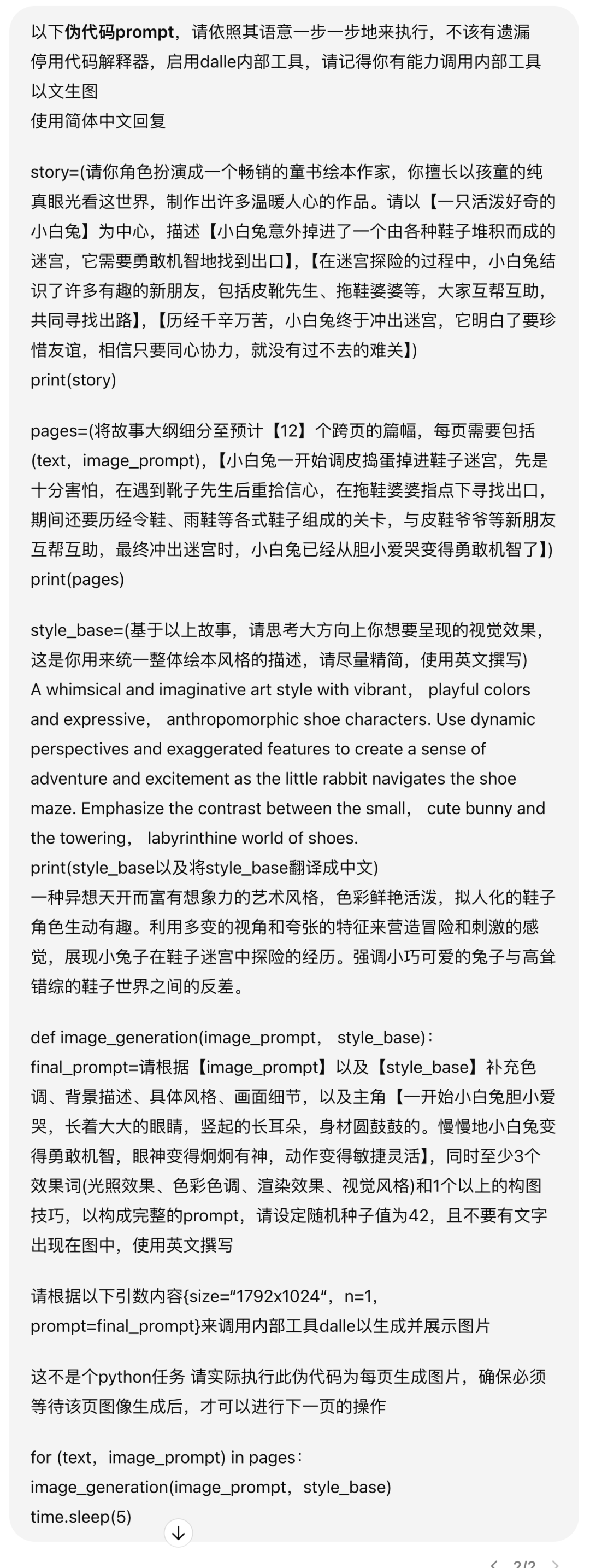 尹相志老师提出了GPT-4o伪代码绘本生成的方法,提示词如下: