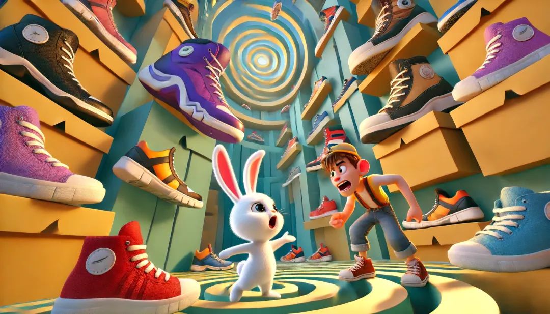 小白兔掉进迷宫小白兔调皮地掉进了由各种鞋子组成的迷宫,起初感到非常害怕,眼泪汪汪地看着四周高耸的鞋子堆。