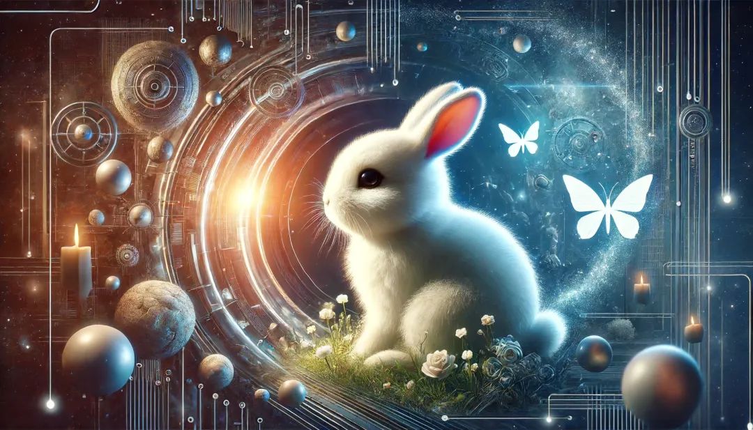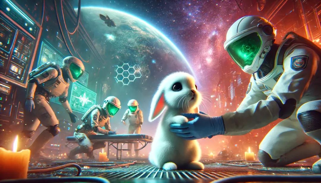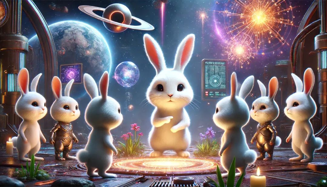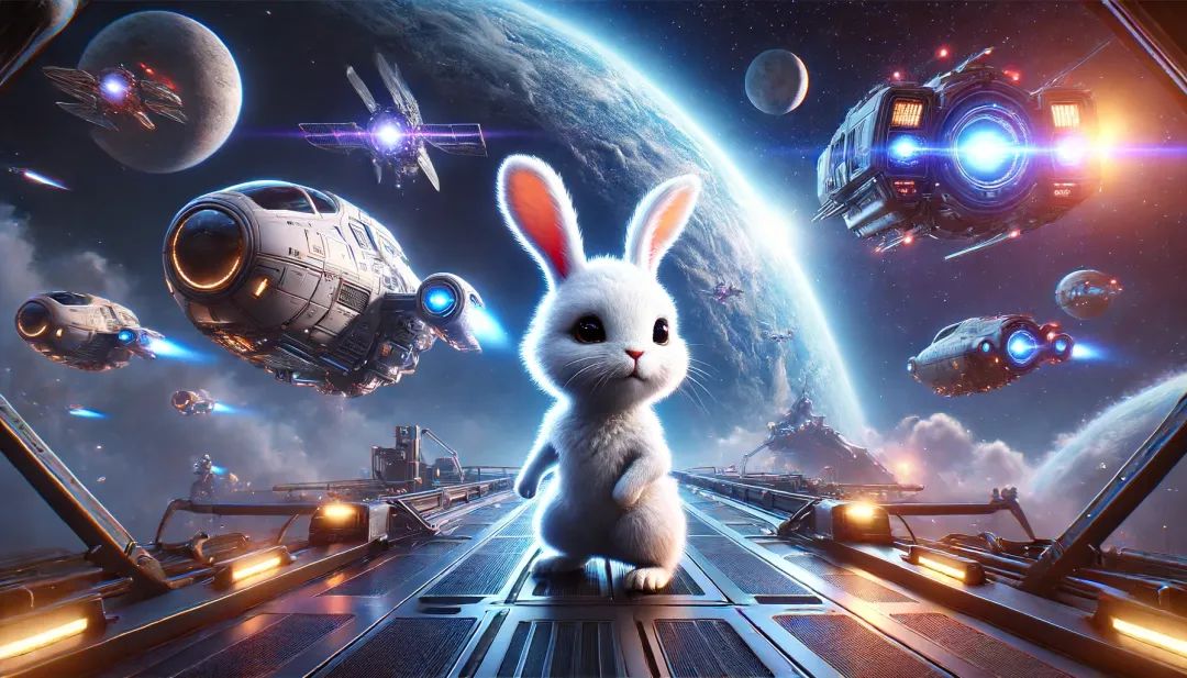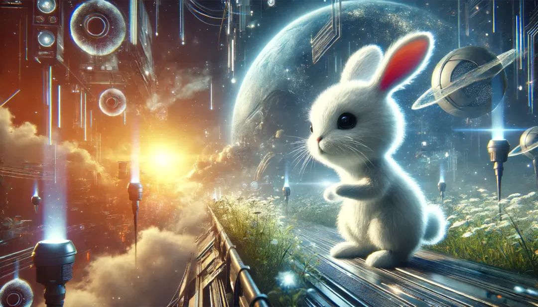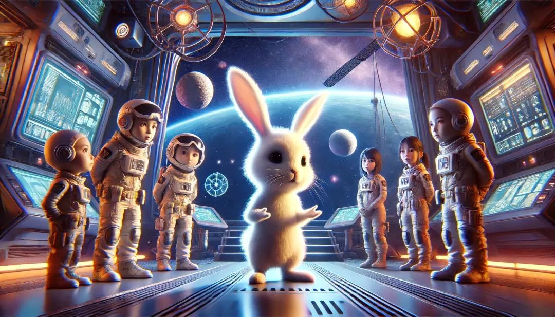 小白兔充满好奇地登上未来飞船,飞船内部充满了先进科技和迷人的光影效果。