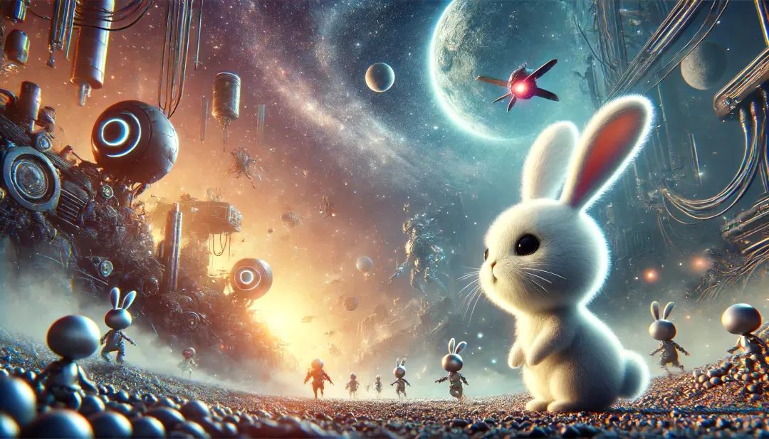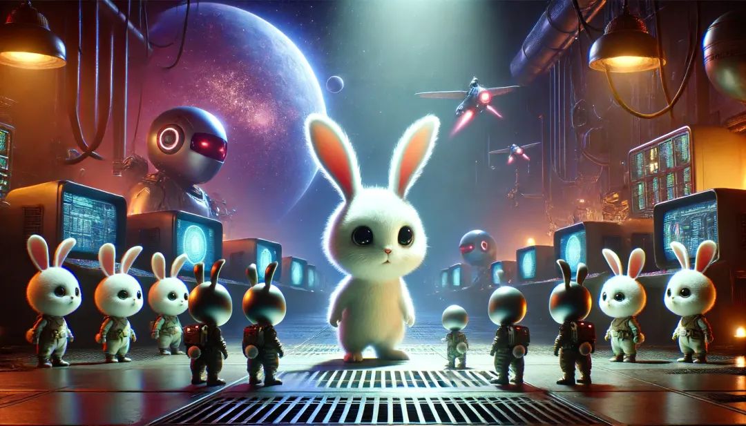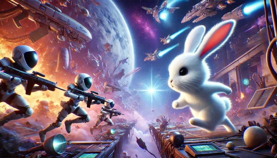 小白兔和朋友们与敌人展开最终战斗,场景壮观,充满了科技和史诗般的视觉效果。