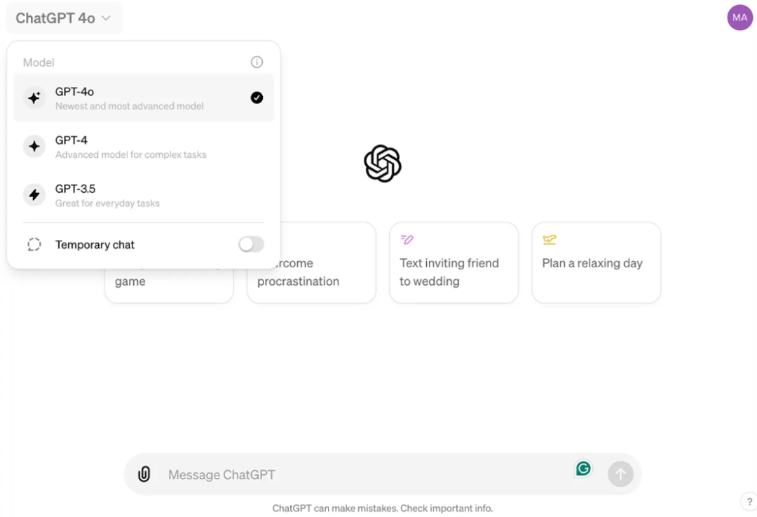 你会看到左上方有一个下拉菜单,可以在以下几个模型中进行选择:GPT-4o、GPT-3.5、GPT-4 以及 Temporary Chat(临时聊天)。