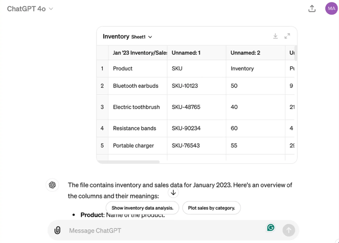 你可以从设备、Google Drive 或 Microsoft OneDrive 上传电子表格。ChatGPT 会将其导入并制作成聊天中的互动表格。