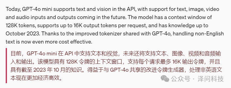 GPT-4o mini不仅支持文本和图像处理,未来还将增加对视频和音频的支持。它能够处理多达128K token的长上下文,利用其快速响应能力,可应用于不同场景,如客户服务聊天机器人和代码库管理,更适合同时调用多个API的应用程序。