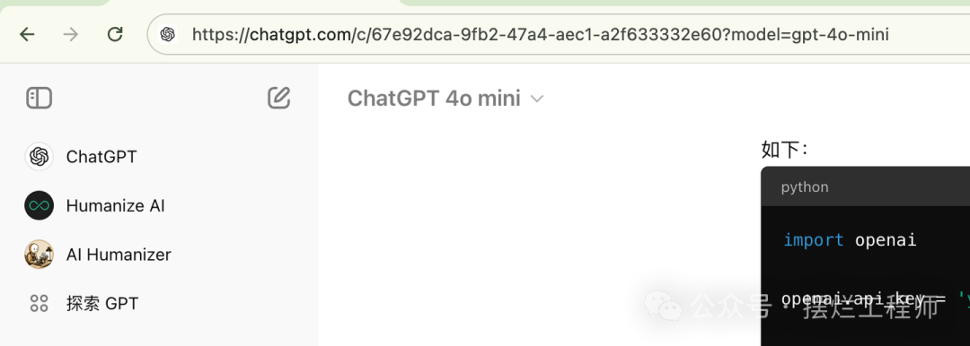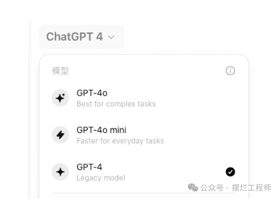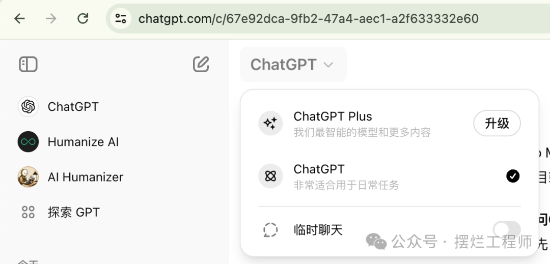 默认选中的是ChatGPT,GPT-3.5已经在web页面上下线了。现在是默认使用gpt-4o,如果需要使用gpt-4o mini的话,有两种方式: