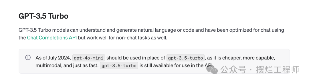自 2024 年 7 月起,使用 gpt-4o-mini 代替 gpt-3.5-turbo ,因为它更便宜、功能更强大、多模式且速度同样快。gpt-3.5-turbo 仍然可以在 API 中使用。