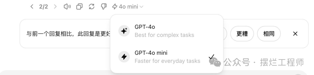 另一个方法,就是你在问问题时,默认使用了gpt-4o模型的,你只需要在回答的下方直接切换你想要的模型。