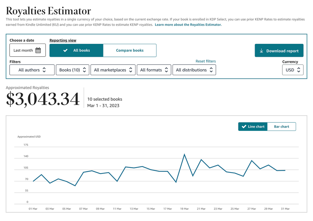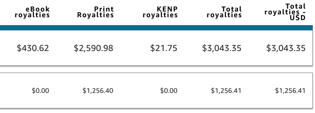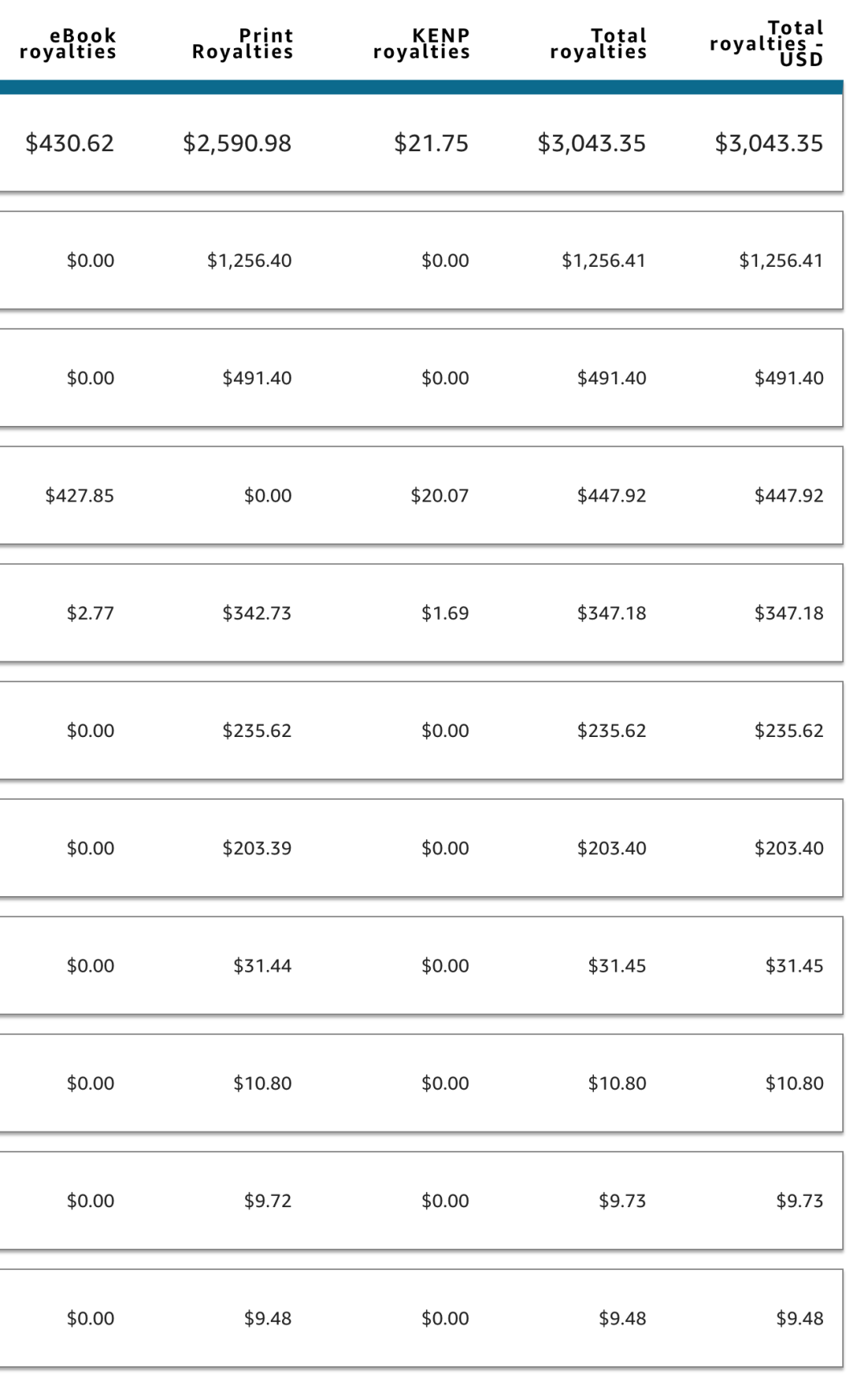 这是我自 2023 年 3 月以来所有十本书的版税明细。
