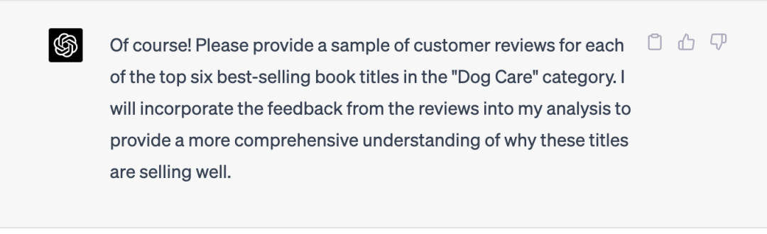 感谢您提供客户评论。根据这些评论和对“狗狗护理”类别前六大畅销书的分析,我可以找出当前畅销书可能无法完全解决的一些差距和兴趣。以下是一些可能填补这些空白并在市场上表现更好的新书创意: 救援故事:关于收养和照顾救援犬的感人故事和实用建议 本书将读者喜爱的感人故事和感人故事与领养和照顾救援犬的实用建议相结合,以满足越来越多有兴趣为救援犬提供温馨家园的人们的需求。 犬类交流:了解和改善您和您的狗之间的联系 这本书将着重于帮助狗主人更好地了解宠物的肢体语言、发声和行为,使他们能够加强与狗的联系并更有效地解决问题。 养狗要点:养一只快乐、健康的狗的简明指南 一些读者发现当前的畅销书冗长且重复。这本书将提供一个简明易读的指南,涵盖从训练和社会化到营养和健康的狗护理的基本方面,没有过多的填充内容。 正念的狗主人:与您的犬类伴侣建立更深层次的联系 受评论中更多哲学方面的启发,这本书将探讨养狗的情感和心理方面,提供见解和练习,帮助狗主人与宠物建立更深层次、更有意义的联系。 犬类丰富和玩耍:创造性活动吸引您的狗的思想并加强您的联系 这本书将着重于为狗及其主人提供广泛的有趣和引人入胜的活动,解决通过游戏进行精神刺激和建立联系的需求。 富有同情心的训练师:积极的、基于关系的狗训练指南 本书着重于积极强化和基于关系的训练方法,将为解决常见的行为问题和训练一只行为良好、快乐的狗提供清晰的、循序渐进的指导。 这些新书创意旨在迎合狗主人的兴趣和需求,解决市场空白,并以更具吸引力和简洁的格式提供有价值的信息。
