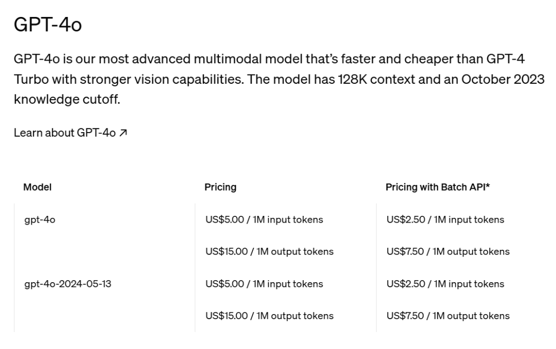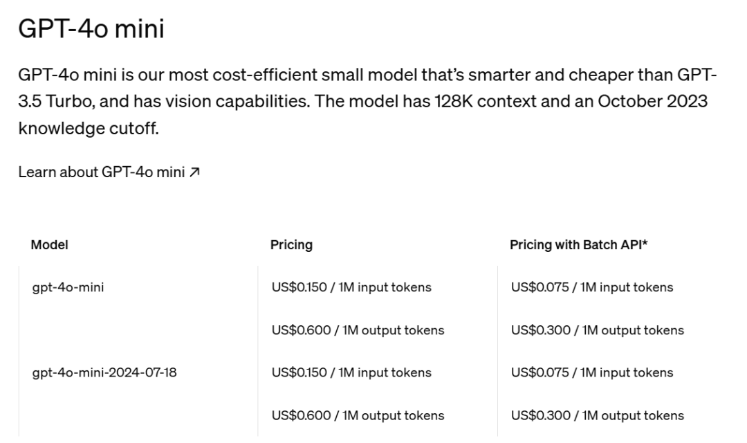 下面两张图分别是OpenAI官方发布的GPT-4o和GPT-4o mini的报价。