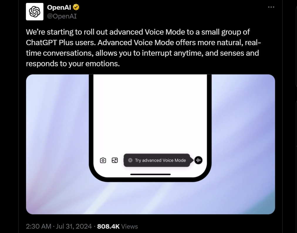 7月31日,OpenAI 宣布了一个重大更新,他们将向部分 ChatGPT Plus 的付费订阅用户开放 GPT-4o 的语音模式。这项更新将允许用户与 AI 进行更加自然和流畅的对话。
