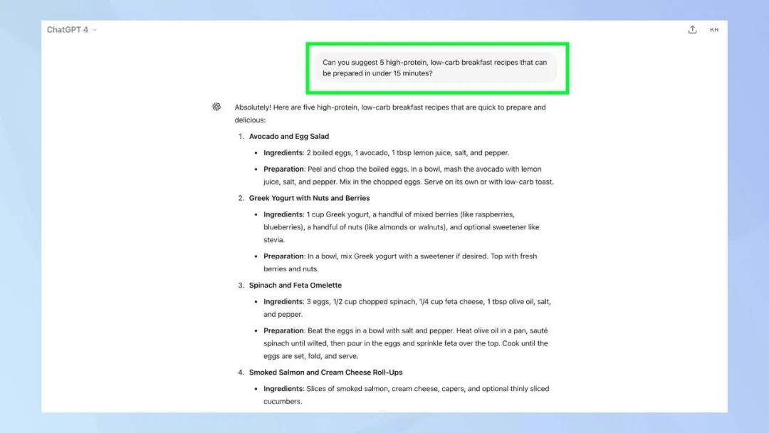 而问“你能推荐 5 种高蛋白、低碳水化合物的早餐食谱,并能在 15 分钟内准备好吗?”这样的问题会得到更具体、更有针对性的答案,更能满足你的需求。”
