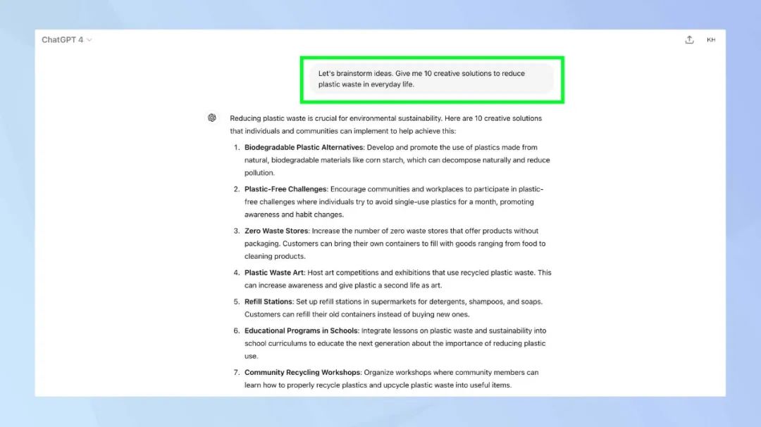 例如,你可以问 ChatGPT:“我们来头脑风暴吧。给我 10 个提升我们产品用户体验的创意解决方案。”