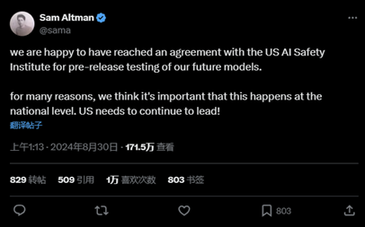 NIST在其官网发布的新闻中表示,美国政府、OpenAI和Anthropic之间的协议“将使如何评估能力和安全风险以及减轻这些风险的方法的合作研究成为可能”。根据协议,两家公司都同意让美国人工智能安全研究所在他们向公众发布新模型之前先进行测试。![]()