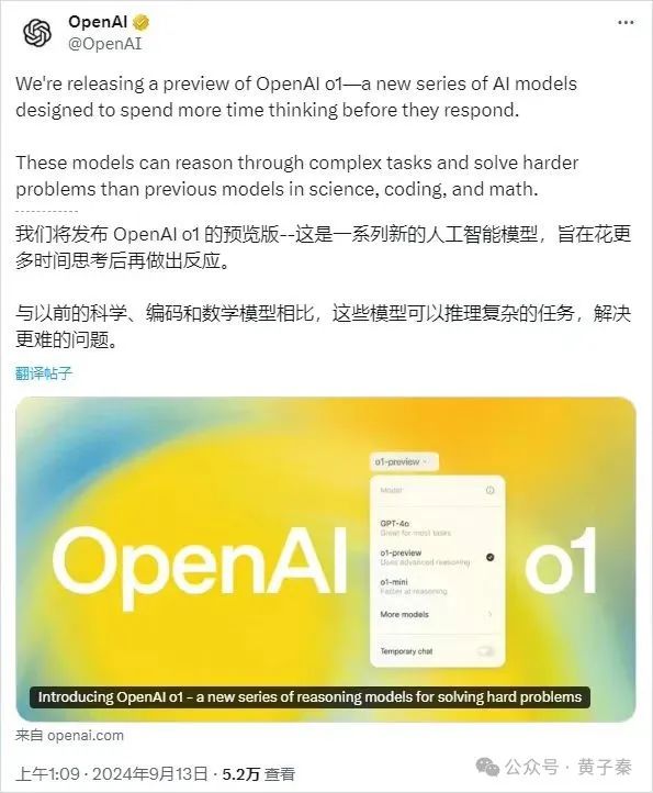 o1的定义与命名:OpenAI推出的新模型o1,打破了以往GPT系列的命名,直接将版本计数重置为1,表明了这是一个全新的开始,象征着AI能力的跃迁。o1的命名和重新计数传达了一种决心和自信,即这次的技术革新足以重塑AI的基础。 技术进步的标志:OpenAI明确表示,o1在复杂推理任务上的表现是一个显著的进步,这意味着其在逻辑推理和决策能力上已经达到了前所未有的高度,逼近甚至超越了人类专家水平。
