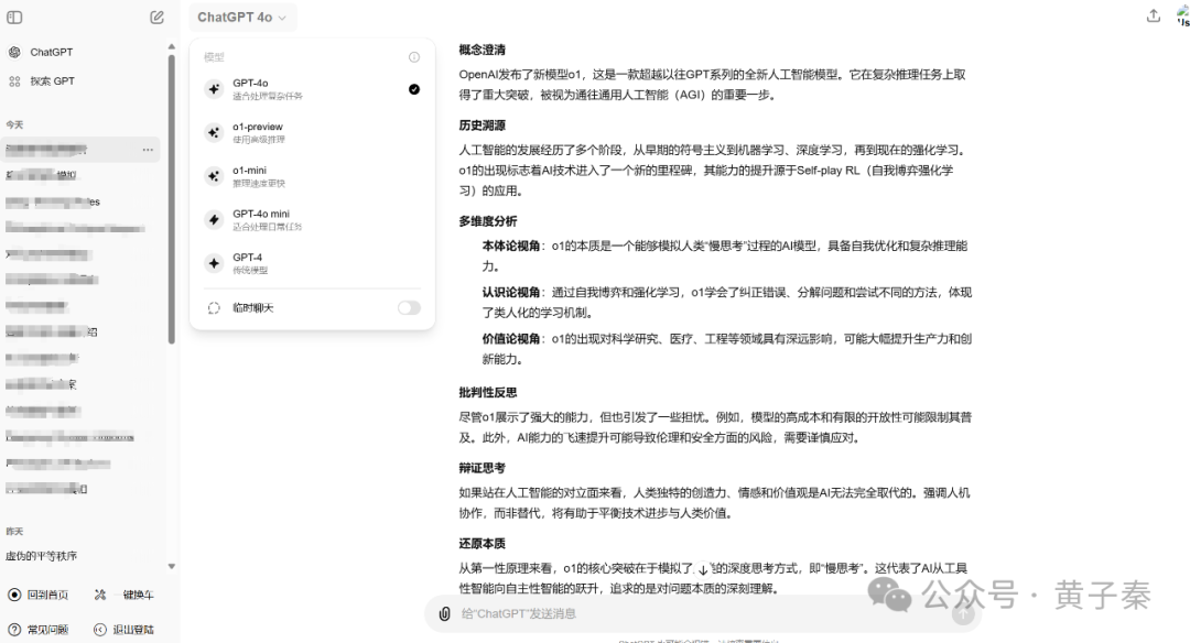 历史视角:回顾AI发展历程,从最初的符号主义AI到机器学习、深度学习,再到如今的RL(Reinforcement Learning,自我博弈强化学习),每一次技术突破都推动了AI能力的极大提升。o1的出现标志着AI不再是单纯的模式识别工具,而是具备“慢思考”能力的智能体,这将对未来产生深远的影响。 哲学与认识论:o1的自我学习和错误纠正能力代表了一种更接近人类思维的进化。哲学家丹尼尔·卡尼曼提出的“快思考与慢思考”理论揭示了人类思维的双系统模型,而o1正是首次在AI领域实现了这种思维方式的模拟,赋予了AI一种更“人性化”的思维过程。 价值与伦理:o1不仅仅是技术上的突破,更是对AI在社会中扮演角色的重新定义。随着其能力的增强,o1在各个领域的应用潜力巨大,如医疗、科研、工程等,但同时也需要更严格的伦理考量,防止其被用于不正当用途。