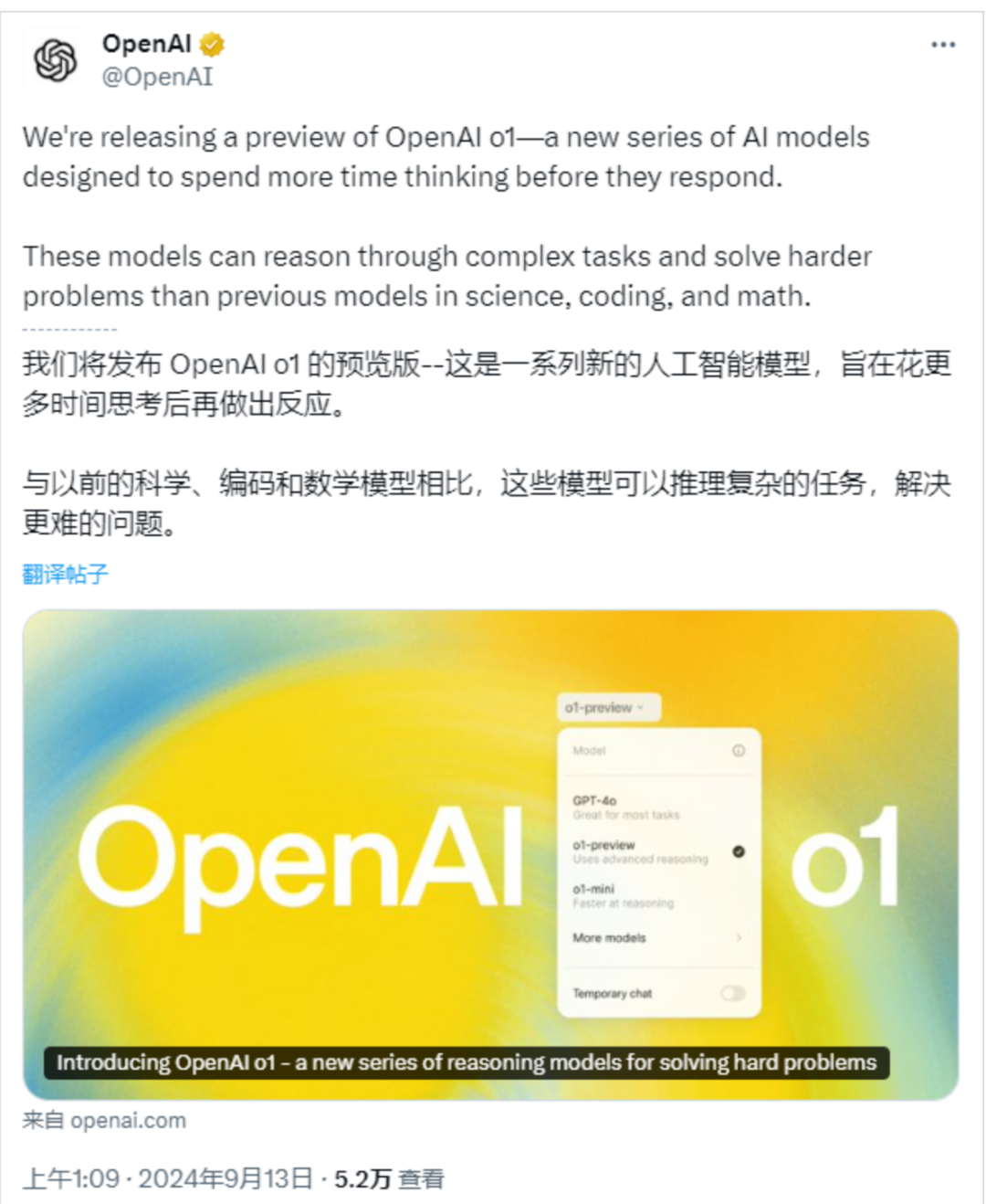 此次发布的 o1 模型,标志着 AI 行业迈入了一个全新的时代。