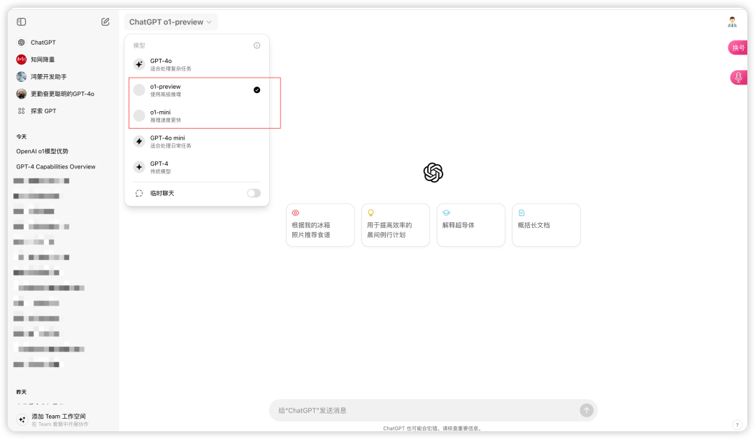 这里可选择o1-preview(高级推理) 和 o1-mini(更快的推理速度) 两个模型。