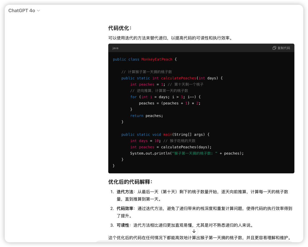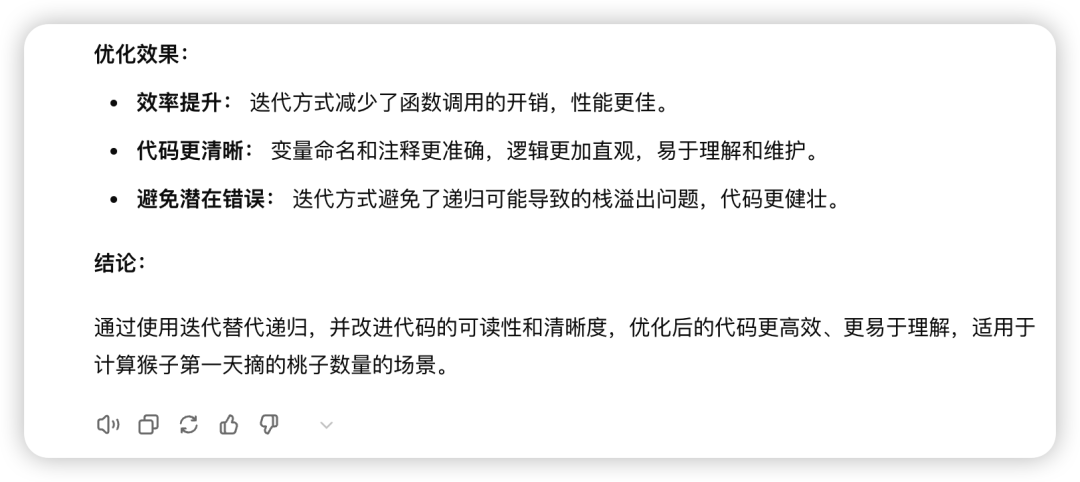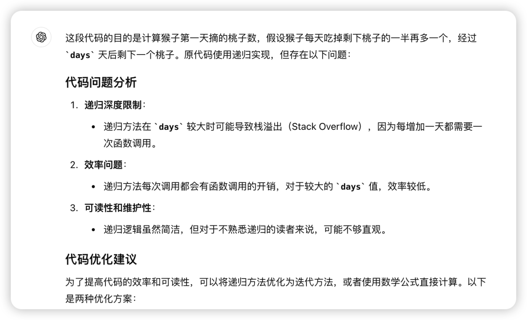 可读性较差:递归方式使得代码的逻辑不够直观,可读性不高。多增加了优化建议。使用迭代替代递归:迭代方式更高效,避免了递归调用的开销和可能的栈溢出问题。