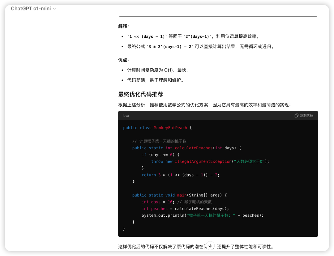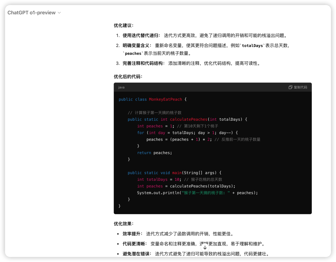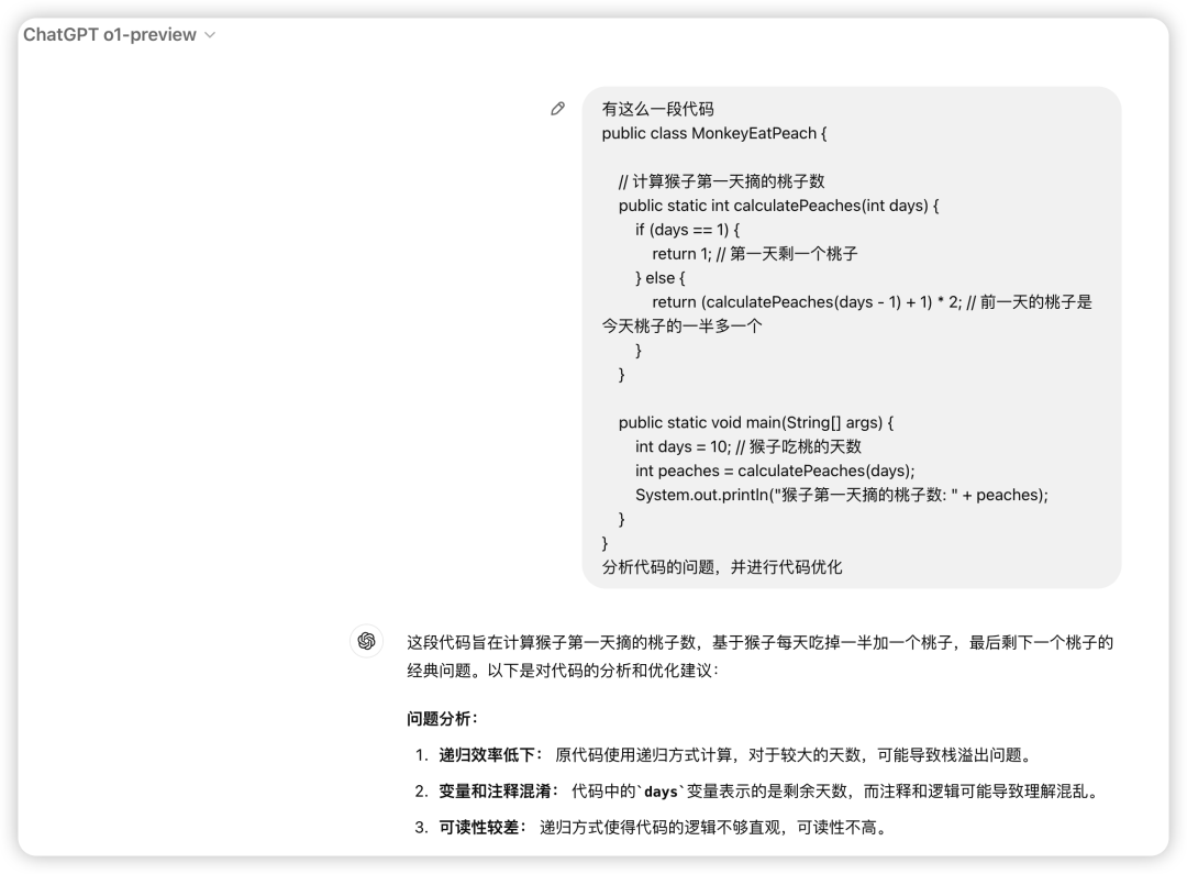 o1-preview是给出了问题分析:递归效率低下:原代码使用递归方式计算,对于较大的天数,可能导致栈溢出问题。