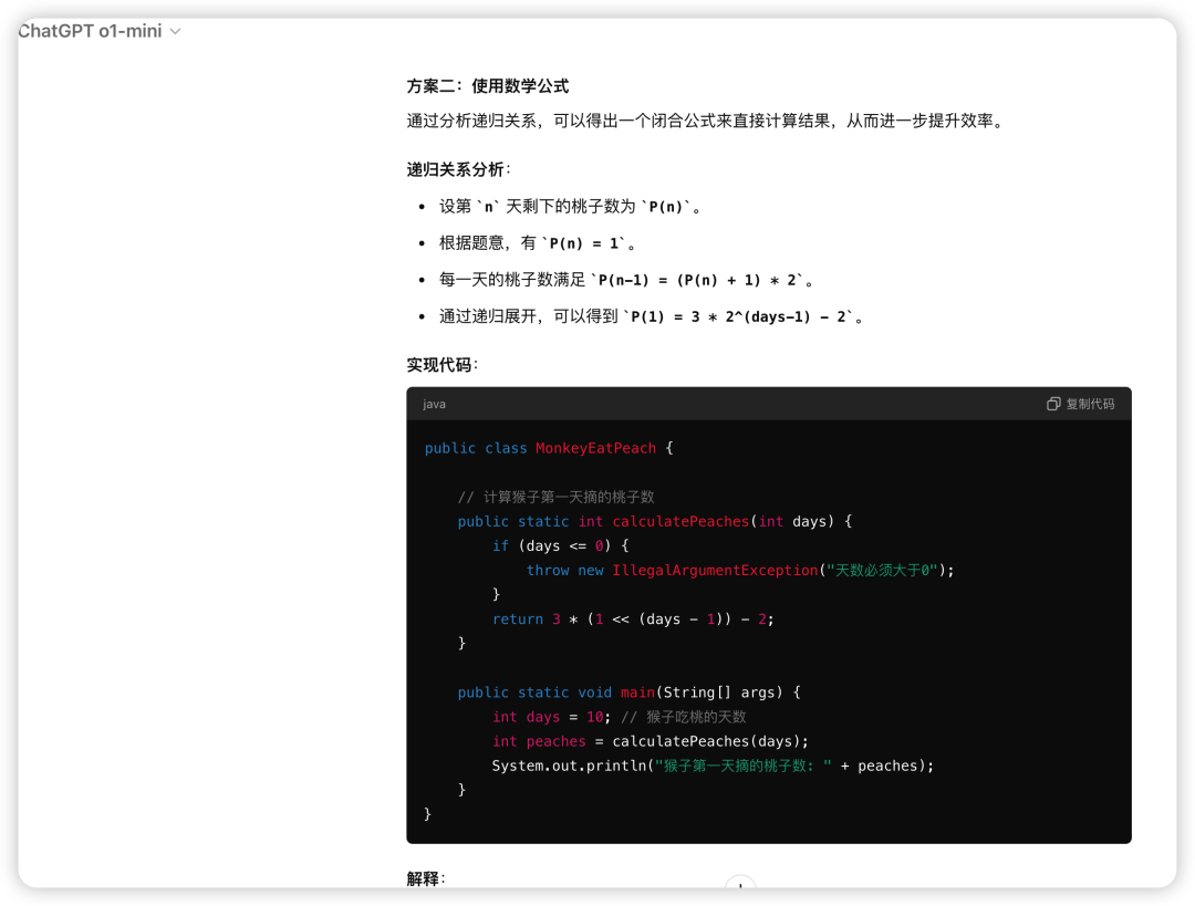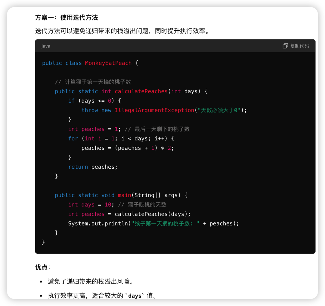 递归深度:该方法使用递归来计算第一天的桃子数,递归深度为days,在days较大时可能导致栈溢出或性能问题。