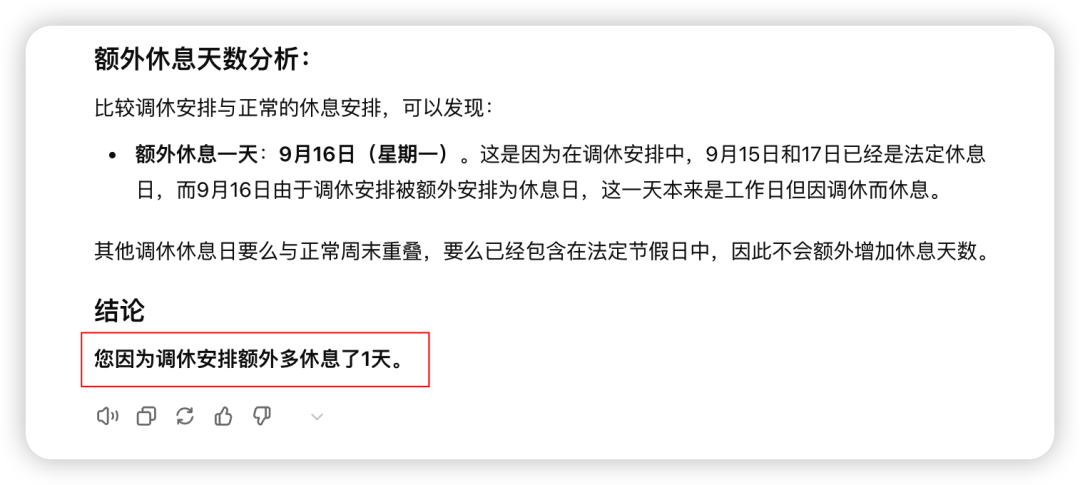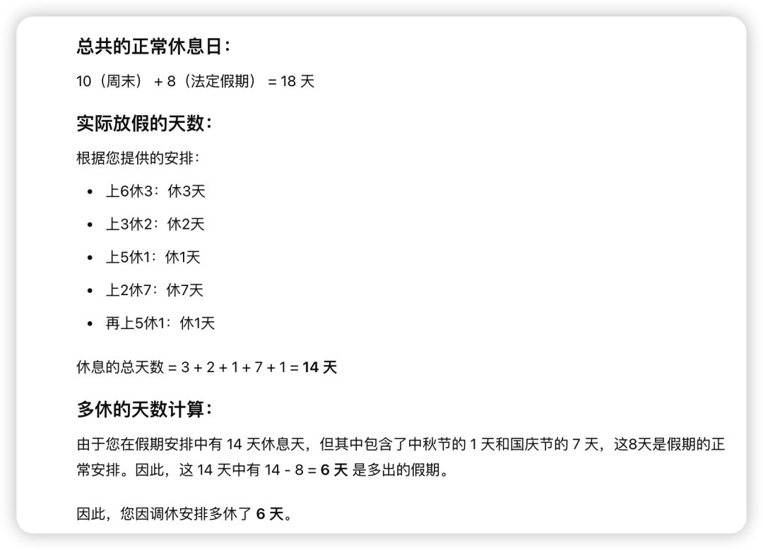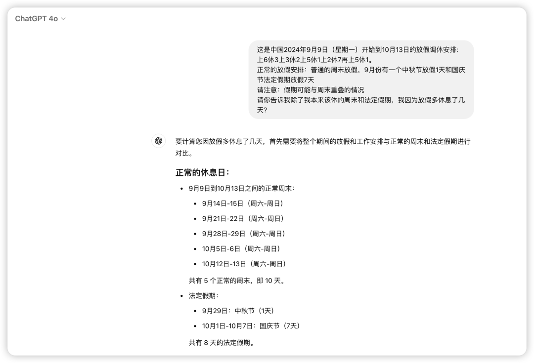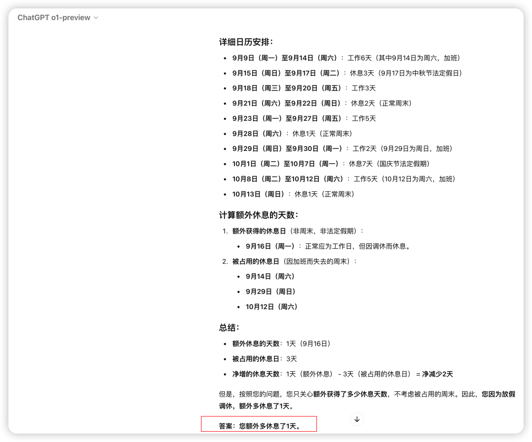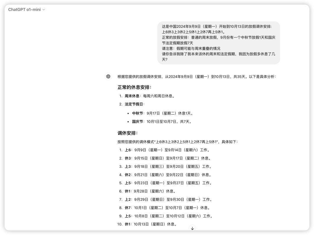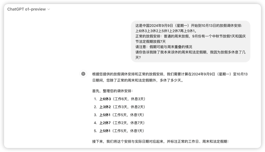 请你告诉我除了我本来该休的周末和法定假期,我因为放假多休息了几天?分别对Gpt4o、o1-preview(高级推理) 和 o1-mini(更快的推理速度) 进行测试。