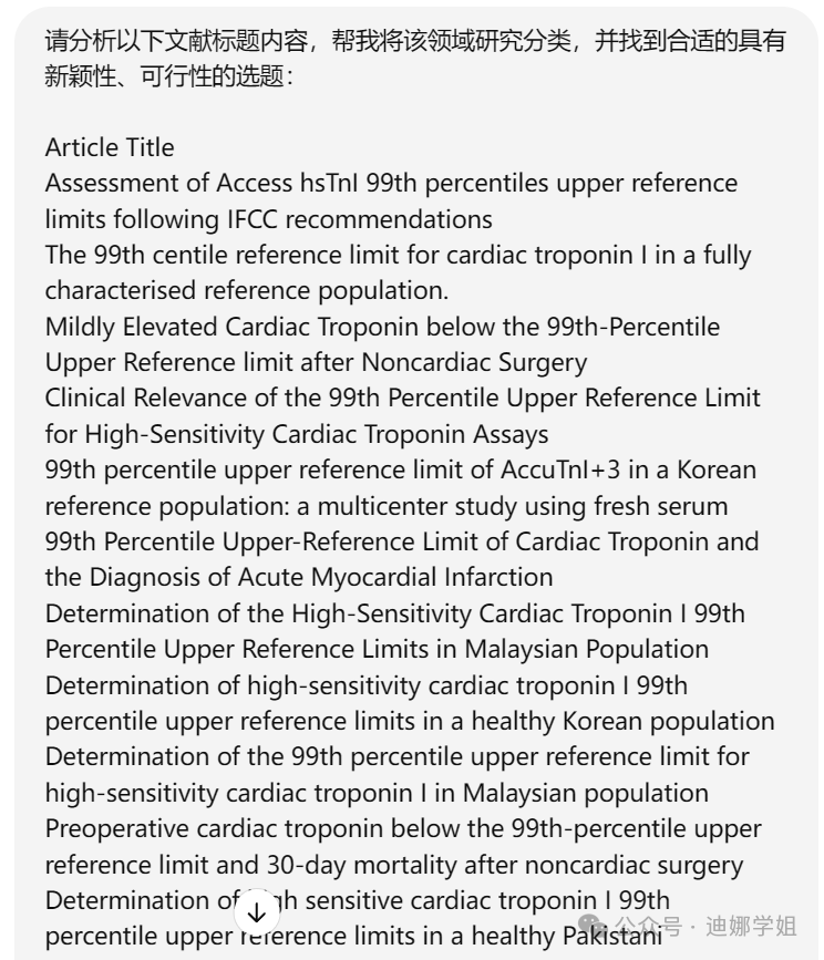 首先我们提交某一关键词下的一批文献标题,让它分析分类并寻找可能的选题: