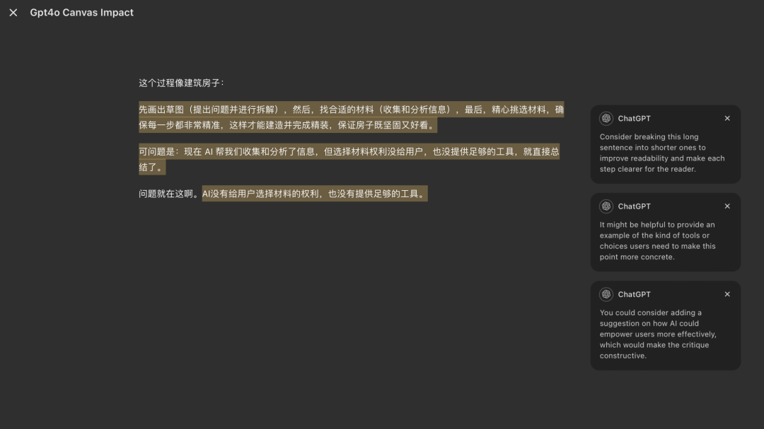 图:GPT-4o with canvas整个页面布局左边布局是“问题框”,指令调动的地方;右边的布局是面看板,俗称“canvas”。右下角有五个图标,从下往上分别是:添加表情符号(Add emojis)、最后阶段完善(Add final polish)、阅读水平(Reading level)、调整长度(Adjust the length)和建议编辑(Suggest edits),这些是它的关键功能。先说说表情包。只要点一下,就能自动在文章里加各种表情。就好比你在小红书上写东西,排版不行,扔给它,它马上就能整理好。再来看看调整长度的功能。这个可以帮你整理文章的结构,比如:把文章分成主题、标题、段落等不同部分。那么,Reading level这个功能是干嘛的呢?它可以控制页面显示的大小。你往上滑,页面就会变大;往下滑,页面就缩小。这和我们平时浏览网页时放大、缩小看内容是一个道理。最后是Suggest edits。这个功能,就像是帮你纠正文章逻辑的小助手。比如它觉得我这句话太长了,就会建议我把长句子改短,或者在某个理论下面加个例子,让内容更易懂。![]()