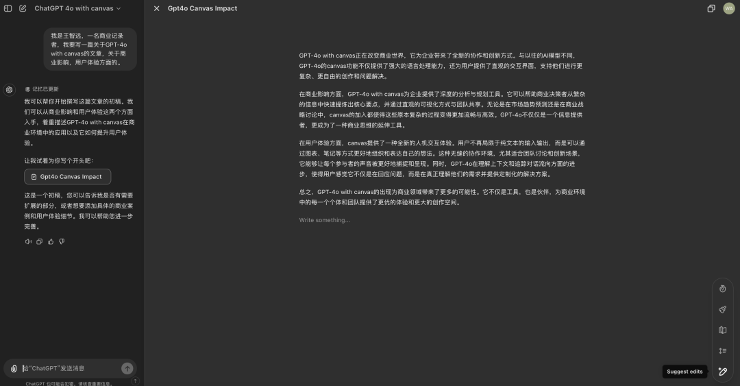 图:GPT-4o with canvas,Suggest edits演示第一,GPT-4o with canvas提供了一个全新的页面。这个页面被组织得更有条理,还加入了提示词;这意味着,如果你能好好利用提示词,就能更自由地创造你想要的内容。第二,这是一个巨大的进步,它解决了AI生成内容中的“过程性”问题。这意味着,以后如果AI生成了你不想要的内容,你也不用再担心替换不掉了。我要写一篇报告。在用AI帮我写初稿时,会有些部分我觉得不合适,或者不需要;以前,如果AI写的内容有不对的地方,不能改。现在,有了canvas功能,我直接可以轻松修改,或者完全替换掉不想要的内容,让整个文档更符合我的要求,这样一来,我就可以更自由地控制最终的报告内容。因此,通过这一个功能的更新,它颠覆的不仅是AI搜索、还包括内容编辑、个性化定制。这就意味着,我不仅能更准确地找到我需要的信息,还能根据我的喜好调整生成的文本,这种能力应用到不同场合,会让AI工具变得更灵活,更有用。国内会在哪个环节加入画布(canvas)功能呢?如果这个问题能解决,我相信AI搜索产品的商业化会更加多样。想想看,如果我们在需要的时候能自由地添加、修改内容,甚至在过程中调用一些工具功能,这会怎样激发我们的创造力呢?又会怎样收费?我想起了Perplexity的创始人说过的话:搜索的本质是一个答案引擎;它的目的是帮助人们发现新东西,并引导他们向正确的方向前进。也就是说,从搜索结束后,就能让用户拖拽、编辑,那真的太有想象空间了(这句是我说的)。因此,GPT-4o with canvas会改变AI搜索吗?AI的剧情还在不断推进,等到国庆过后,它又将掀起一场什么样的产品革命?