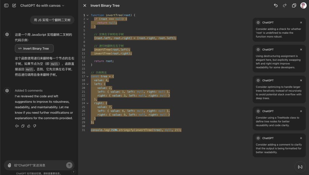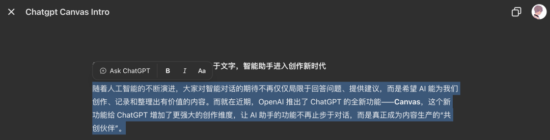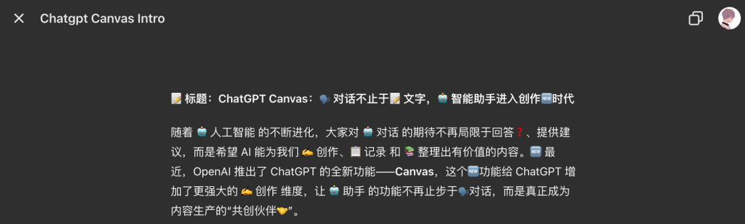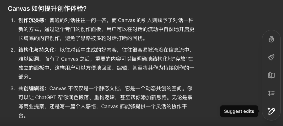 一句话总结:Canvas 是与 ChatGPT 一起写作和编程的新工作方式,能够在写作和编程场景让你与 ChatGPT 更好的协作。