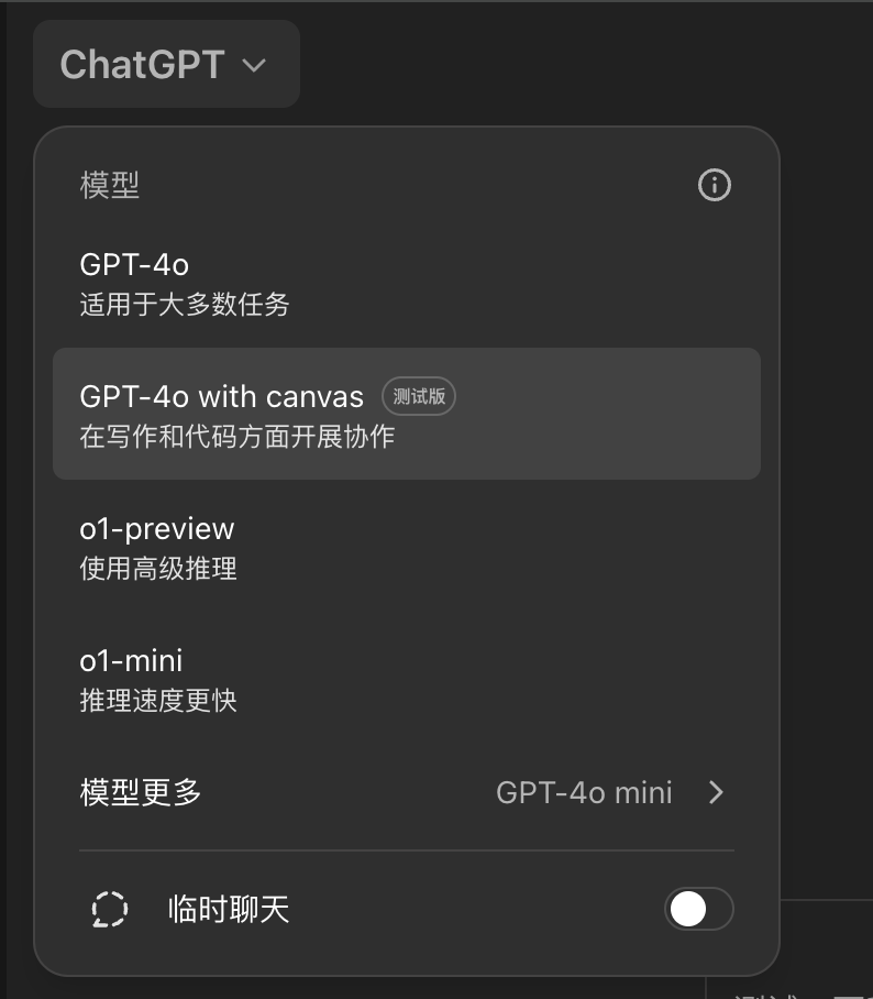 欧巴在第一时间拿到了测试资格,入口在模型切换处,需要手动切换成 GPT-4o with canvas。