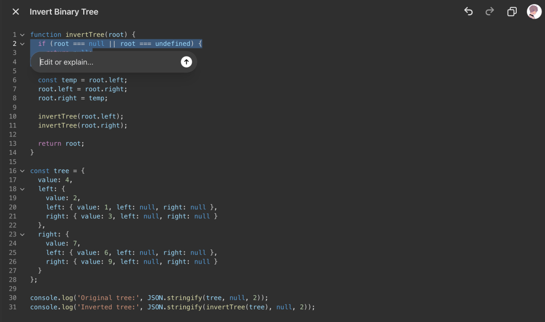 审查代码:ChatGPT 提供内联建议以改进您的代码。 添加日志:插入打印语句以帮助您调试和理解您的代码。 添加注释:向代码添加注释,以便更容易理解。 修复错误:检测并重写有问题的代码以解决错误。 移植到其他语言:将您的代码翻译成 JavaScript、TypeScript、Python、Java、C++ 或 PHP。