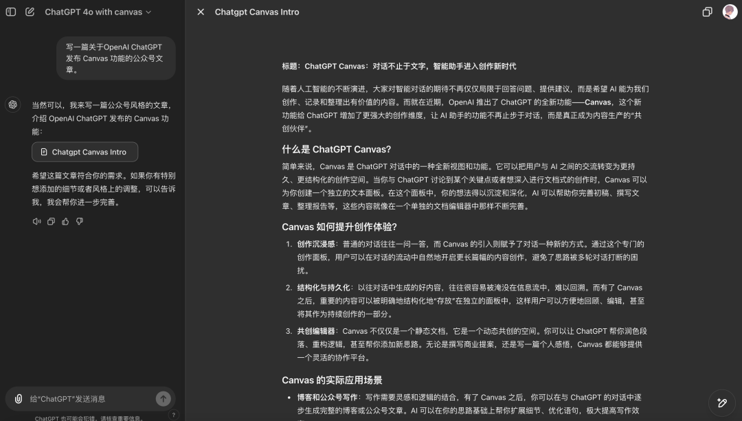 再来看写作,比如写一篇“关于 OpenAI ChatGPT 发布 Canvas 功能的公众号文章”。