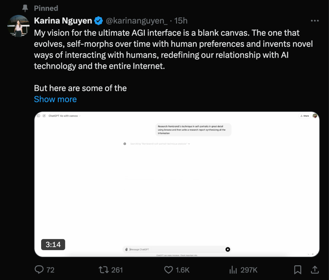 关于 Canvas 功能,其主创是这样说的“我对终极 AGI 接口的愿景是一个空白画布。它随着人类的偏好而演变,随着时间的推移自我变形,并发明与人类互动的新方式,重新定义我们与 AI 技术和整个互联网的关系。”