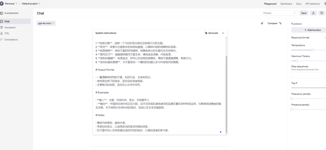 此外,OpenAI Playground还提供了一些优化工具,允许用户根据需要进一步调整和完善生成的提示词。用户可以根据AI模型的反馈,实时修改提示词,以获得更符合预期的输出。这种灵活性使得用户能够在不同的场景下快速适应和调整,进一步提升了用户体验。