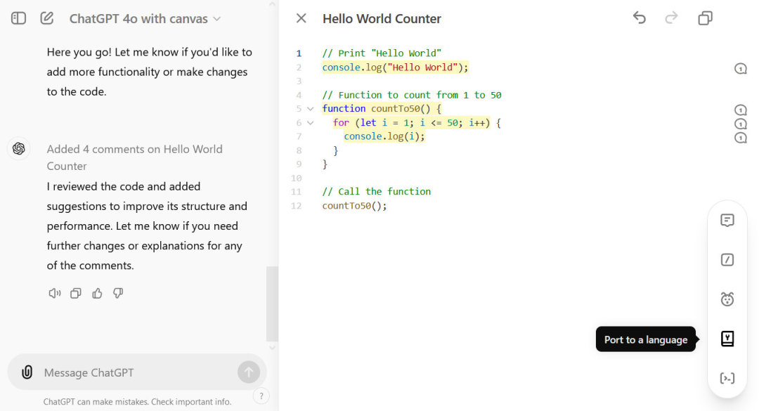 Canvas 还具备强大的编程功能,如代码审查、添加日志、注释、修复 bug 和语言转换。