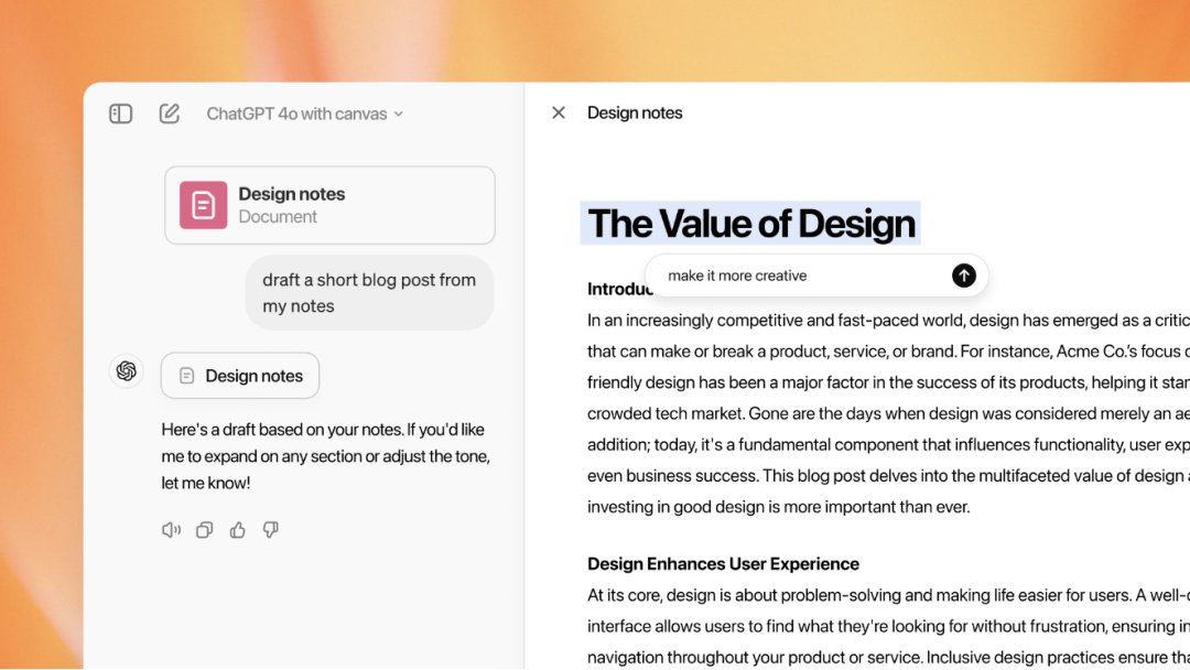 在写作方面,Canvas 提供了一个专为写作设计的工作区,用户可以获得编辑建议、调整文本长度和选择不同的阅读级别。