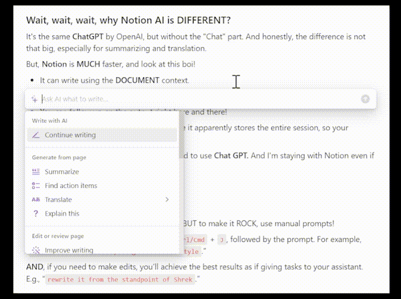 NotionAI被精心设计,自然地融入到Notion的各个功能模块中。它在文档编辑、任务规划和团队协作等方面提供智能辅助,却不会喧宾夺主,成为过于显眼的中心角色。例如,当用户在撰写文档时,AI会适时提供智能建议和文本补全;在制定计划时,AI则会协助生成任务清单或日程表。这种设计的最大特点是让用户的使用体验更加流畅自然,AI在用户的日常操作中默默提供帮助,却不会打断用户的思路或工作流程。