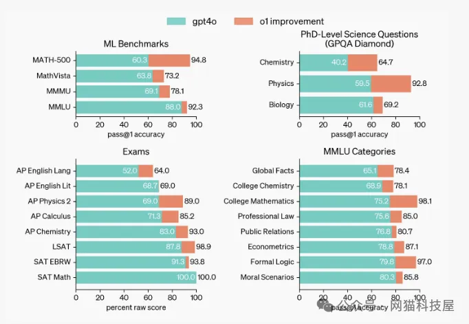 这种差异主要归功于 o1 的强化学习设计,使其在给出答案之前能够进行更深入的“思考”。思维链推理能力赋予 o1 解决多层复杂问题的能力,这使其在数学、编码、物理、化学和生物等领域的任务中表现得尤为出色。