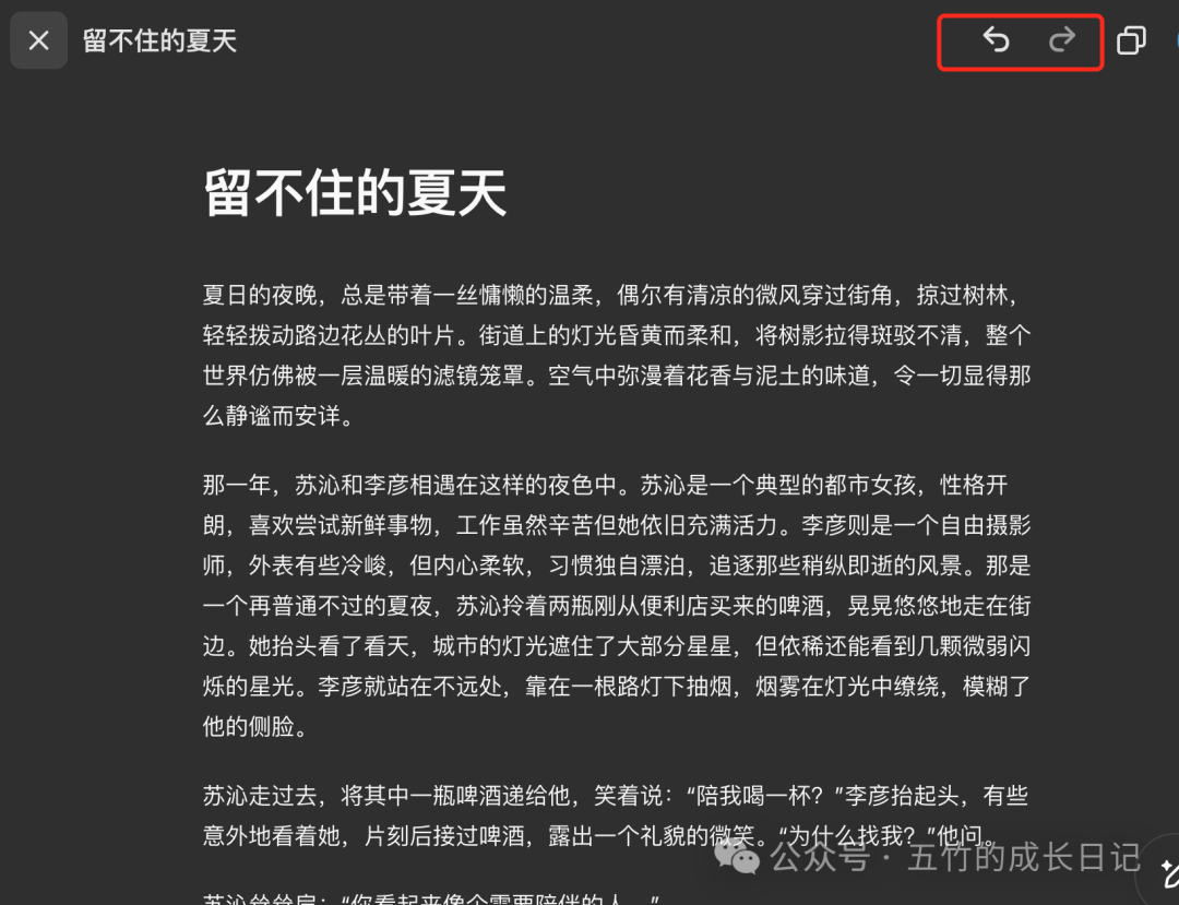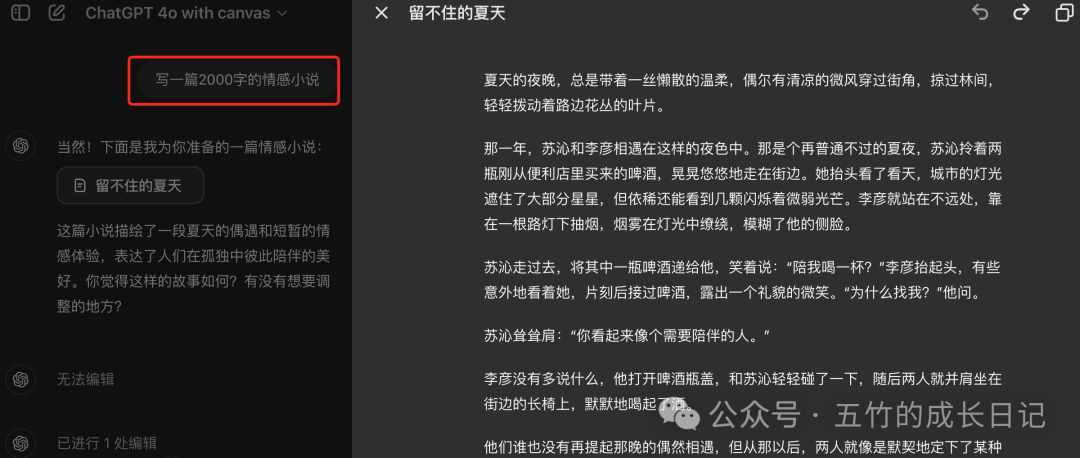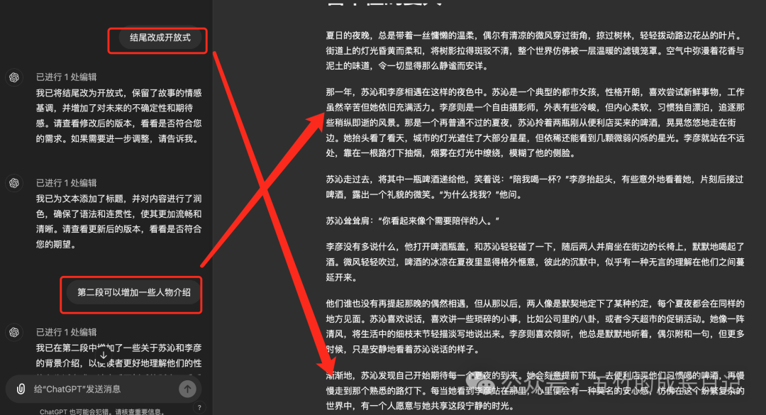 5.最最牛逼的就是下面这个,分段优化的功能。比如我将结尾改成了开放式,又给第二段增加了人物介绍。没有canvas之前,分段优化要基于复杂的分段指令来进行,稍微不注意就会出现上下文不连贯的问题。
