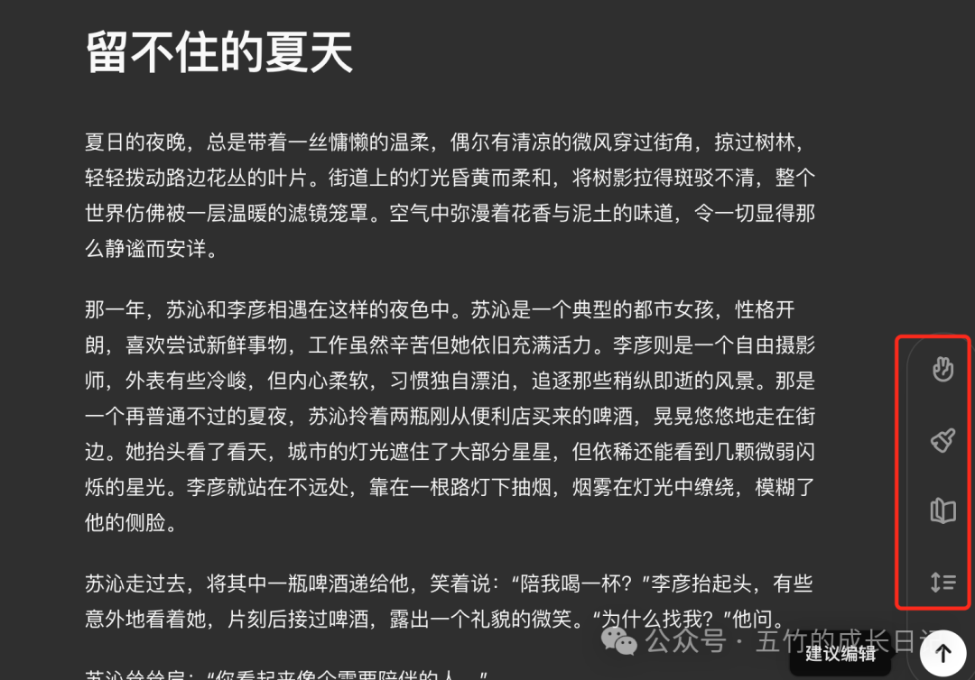3.文章页面的右下角默认提供了四种优化能力:给文章添加表情、对最终的文章进行润色、调整文章的阅读水平(从幼儿到研究生),调整文章的长度。![]()