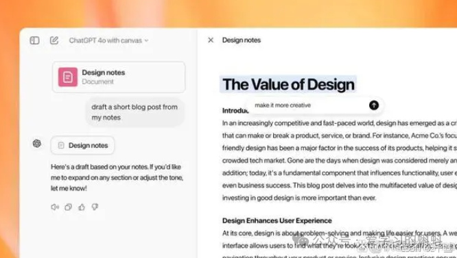 Canvas的设计理念是将ChatGPT的功能从单一的聊天交互,转变为一个更为协同的工作空间。用户可以在这里与ChatGPT进行实时协作,完成写作和编码项目,而不再局限于简单的聊天。