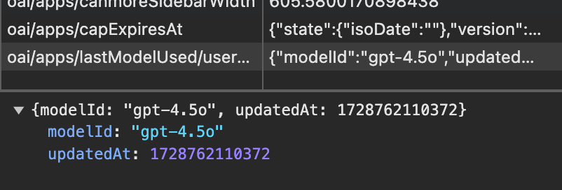 更让人兴奋的是,通过浏览器的本地存储标签,有用户找到了与 GPT-4.5o 相关的内容。