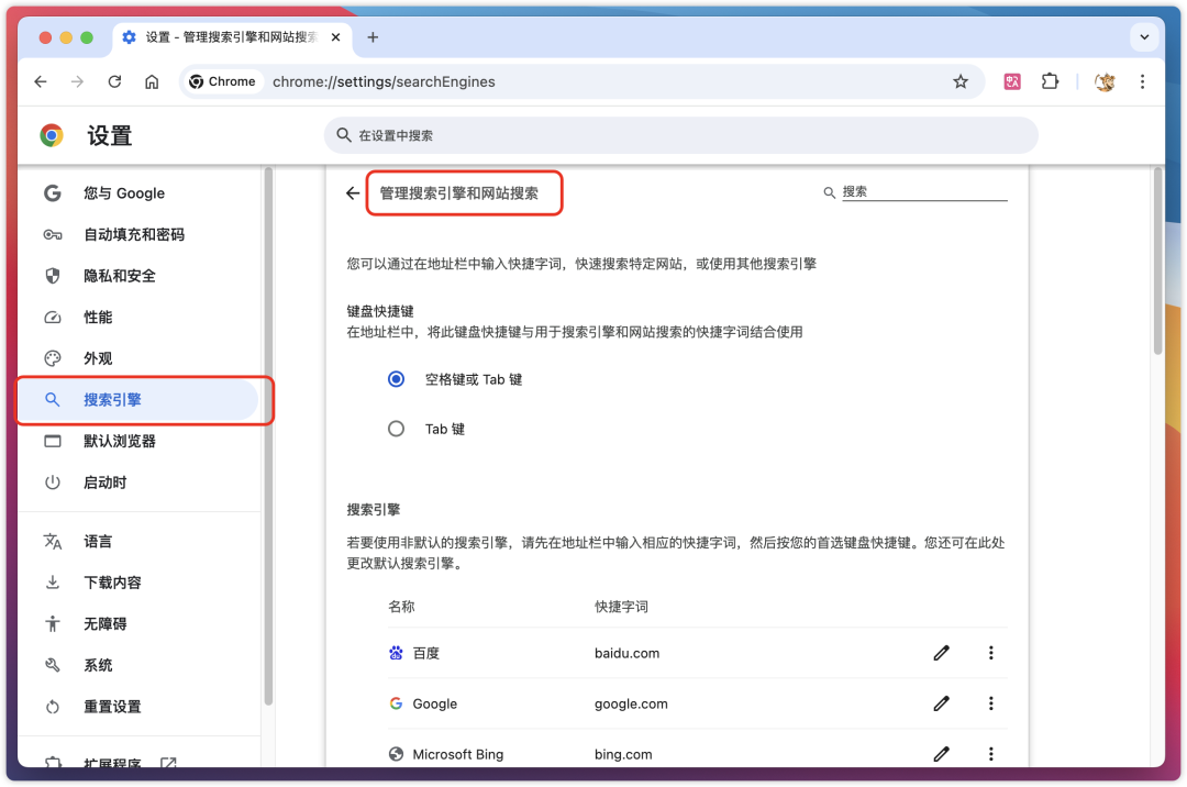 2. 点击“搜索引擎”选项,然后找到“管理搜索引擎和网站搜索”,点击进入;