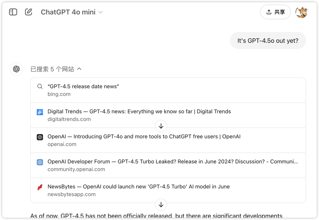 用户现在可以在 ChatGPT 中直接进行网络搜索。