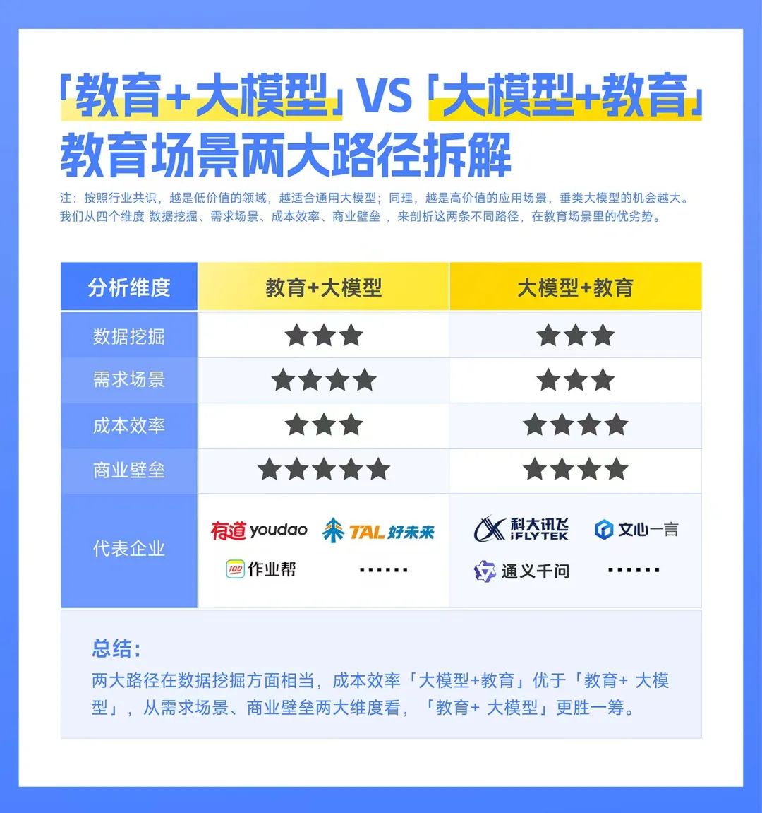 接下来,我们从四个维度(数据挖掘、需求场景、成本效率、商业壁垒),来剖析这两条不同路径,在教育场景里的优劣势。仅以网易有道和科大讯飞为例,不带有商业偏见。