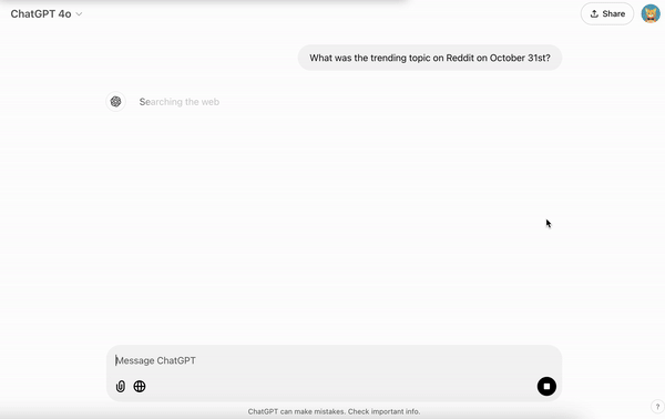 为了进一步测试 ChatGPT search 的实时性有多高,我问它,What was the trending topic on Reddit on October 31st。