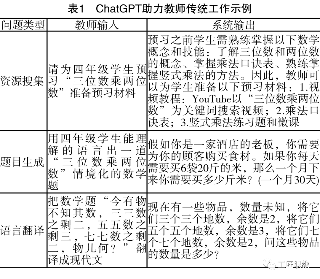 例如:一名小学数学教师将自己设计的《数字与信息》教学设计上传至ChatGPT,提问这份教学设计有待优化之处,并要求ChatGPT预测学生学习状况。ChatGPT从“自主学习任务单的设计、分组活动的设计、可视化工具的应用”等方面提出了教学设计优化建议,并预测了教学实施时学生在认知、情感、行为、社交等维度可能存在的问题,为教师教学改进提供了思路。由此可见,ChatGPT的介入可能提高专家指导和自我发展的效果,加速教师专业能力提升的进程。人工智能技术会取代人类教师吗?ChatGPT被誉为最接近通过“图灵测试”的智能机器,它的出现再次引发这一话题的热议。这场热议将促使教师群体重新审视教师角色与教师使命,成为教师专业情意深化的新引擎。一是驱动教师职业审视,阻抑身份认同模糊化。面对ChatGPT浪潮的冲击,深化教师身份认同必将引起重视。教师身份认同是教师个人和集体对教师地位角色、职责功能的主观感知。如果教师仍然恪守以往信念,仅仅作为体现工具性价值的“经师”,重复着教授书本知识的机器般教学劳动,而不是成为育人的“人师”,将面临被ChatGPT取代的风险。ChatGPT引发的“经师”与“人师”之争,侧面反映了“人师”的不可替代性,为教师身份认同的自我重构提供了契机。二是唤醒教师使命感,坚定教师职业信念。ChatGPT是一种弱人工智能,存在缺乏训练数据、生成虚假信息、数据来源权威性存疑等问题,若学生分辨能力有限,将习得错误知识而不自知。这些可能存在的隐患将激发教师的使命感,促使教师在使用ChatGPT的过程中去粗取精,培养学生的创造力、批判思维等高阶思维。此外,由于没有任何一套算法能确保教育人工智能规避潜在的伦理风险,人工智能难以成为真正的伦理主体,而教育是“一个灵魂唤醒另一个灵魂”,具有显著的伦理性和精神性,只有教师才能承担起教育伦理责任。02