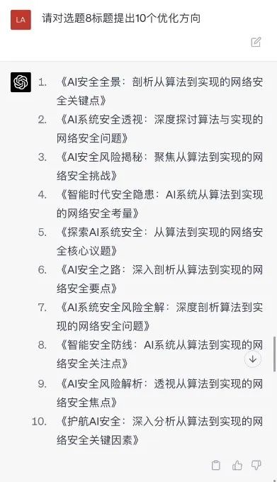 若需在标题风格、措辞均与预期没有明显偏差的情况下,对标题进行进一步改进,也可向 ChatGPT直接发出“优化”指令。同样,在输入指令时,最快速有效的方式是命令ChatGPT一次性提供多个回答,以更迅速、广范围地定位结果。