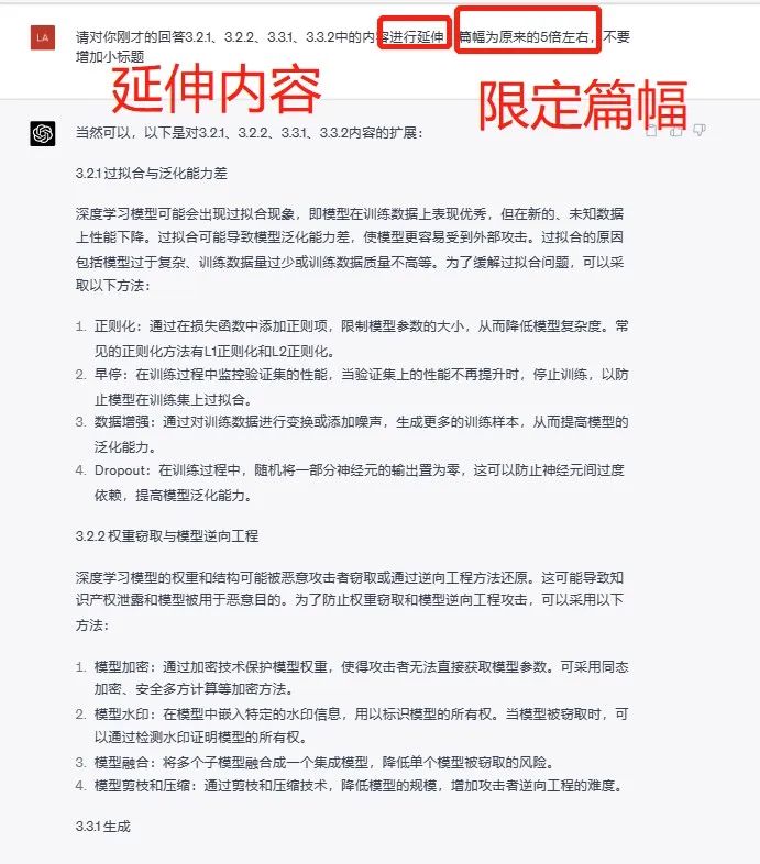 快速扩充内容最省时的做法是,直接要求ChatGPT对生成内容进行补充,可利用“扩充”、“延伸”、“具体说明”等关键词,并限定扩充篇幅。